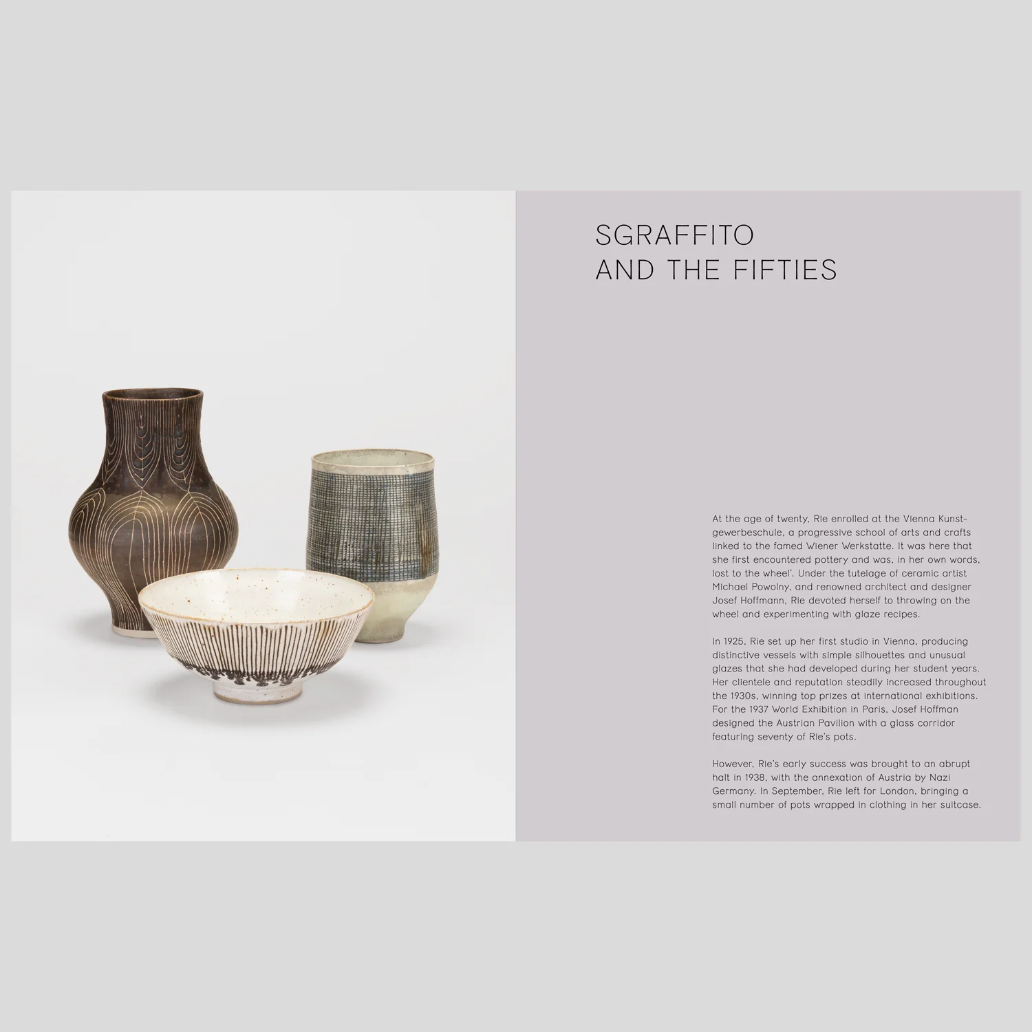 Lucie Rie (1902 â 1995) is one of the finest modern potters of the twentieth century. Born and trained in Vienna, her successful early career came to a halt in 1938 when forced to leave Austria to escape the persecution of Jewish people. In exile in London, Rie established a new workshop and over five decades created highly individual bowls, vases and tableware which continue to amaze and inspire today.