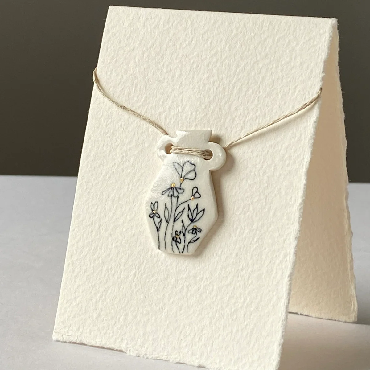 This delicate glazed porcelain pendant features hand-drawn floral decoration and gold highlights. Each pendant has been cut and decorated by hand, making each it a unique mini work of art. Lightweight and easy to wear, the pendants are strung on waxed hemp cord with an adjustable knot to allow the necklace to be worn at different lengths.